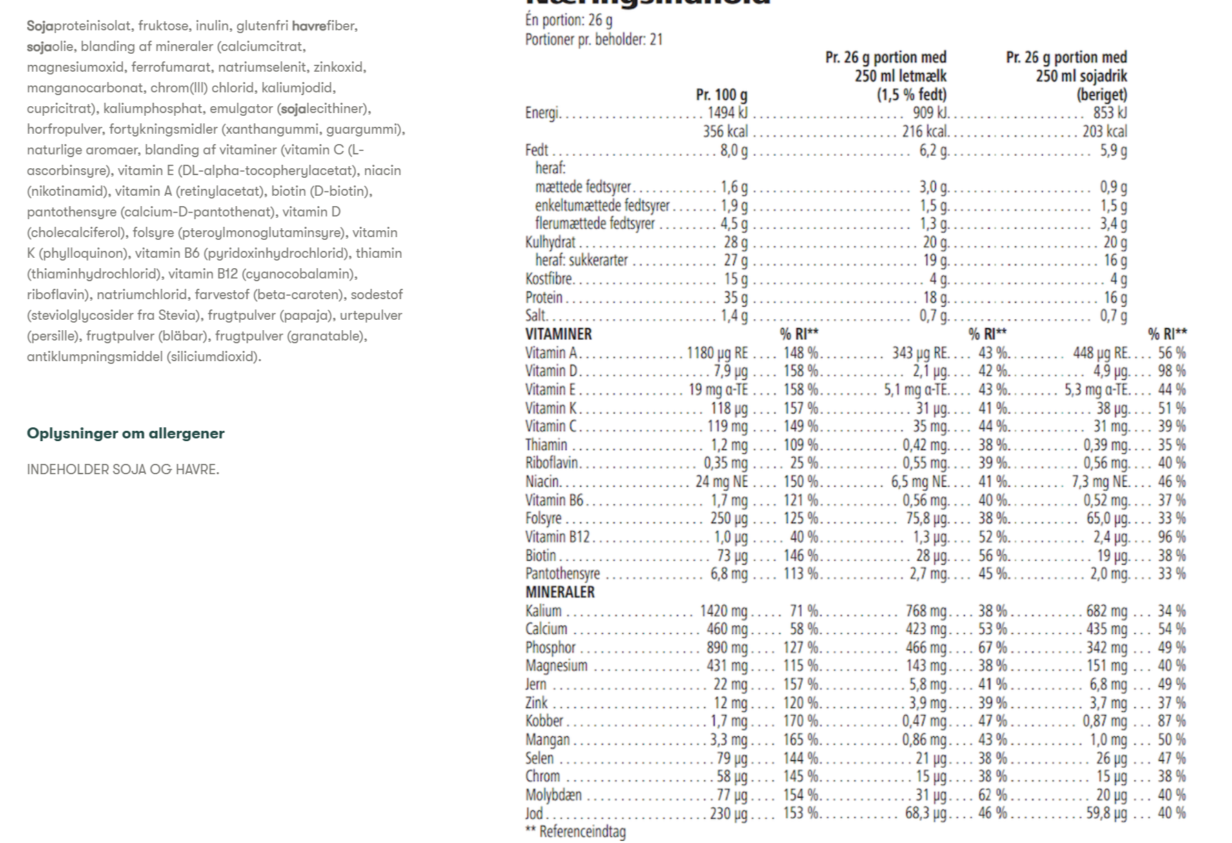 Allergener: Indeholder soja, havre. Kan indeholde mælk afhængigt af tilberedning.